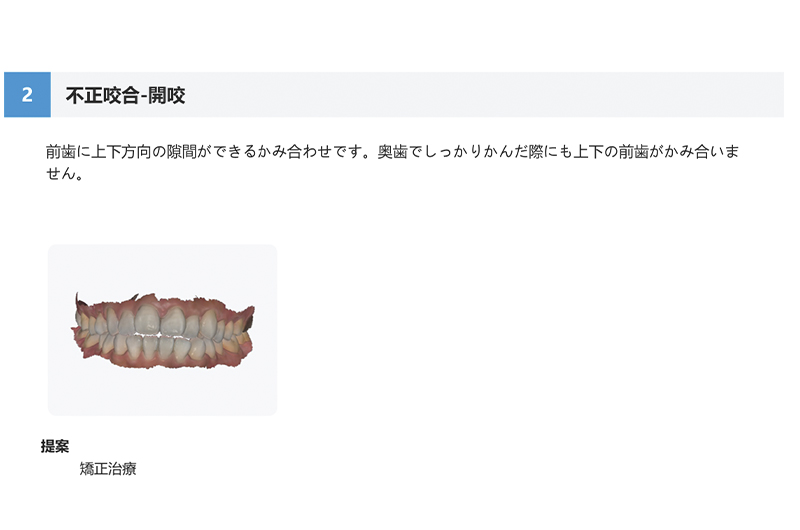 当院では、3Dスキャナーを使用して、口腔内の詳細なデータを高精度に取得いたします。スキャンはわずか数分で完了し、従来の型取りのような不快感もありません。取得したデータはAIによって解析され、虫歯や歯周病の兆候、噛み合わせのバランス、磨き残しの傾向などを視覚的にわかりやすくまとめた「お口の健康レポート」としてご提供いたします。